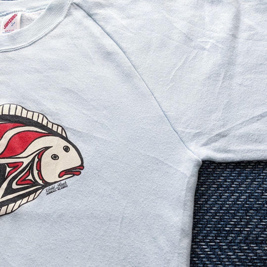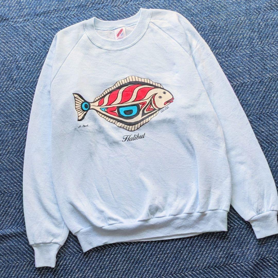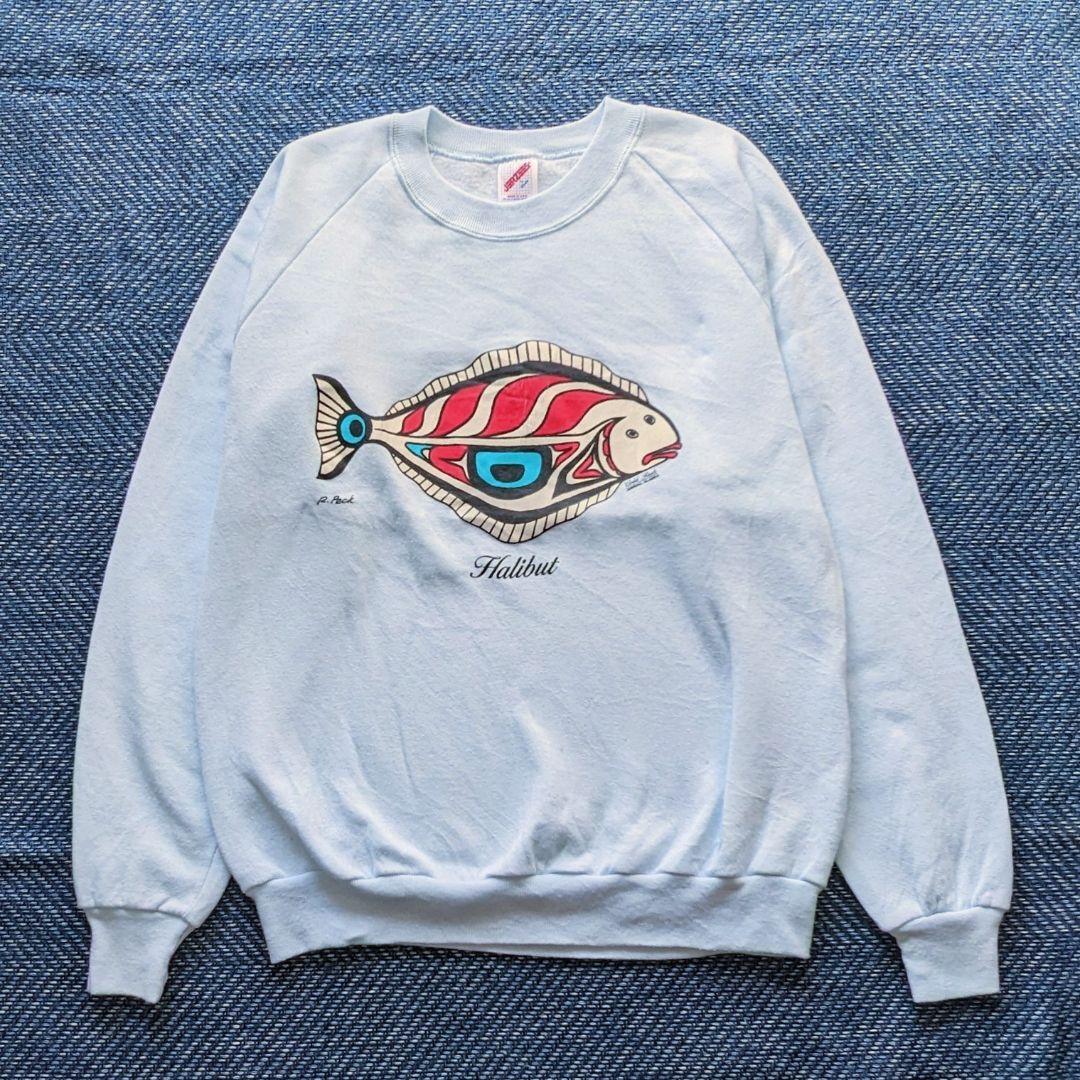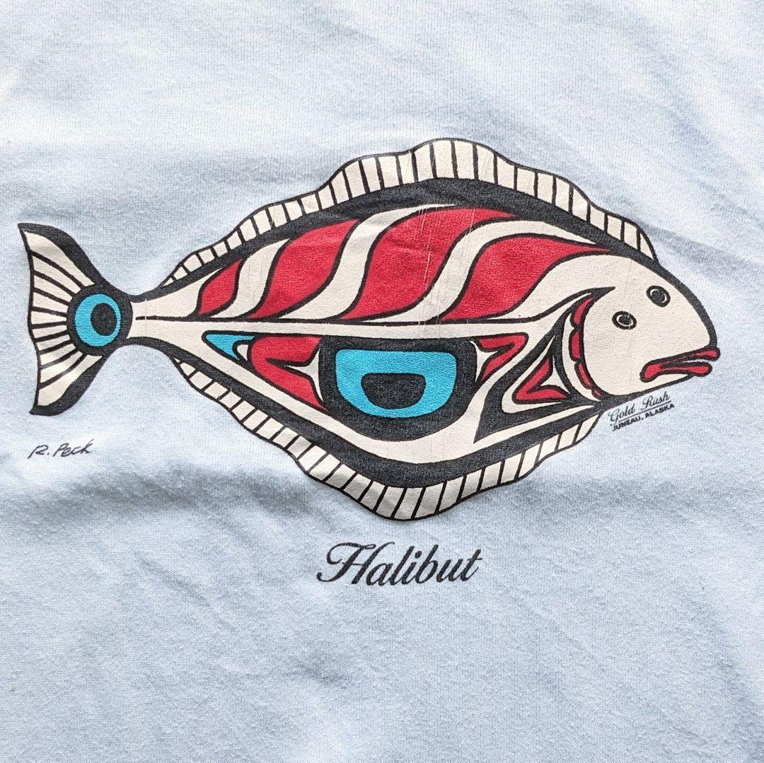 描かれているのは大きなハリバット(オヒョウ)という魚で、アラスカのフィッシング文化を象徴するモチーフです