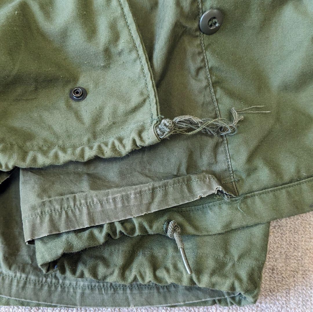 裾部ドローコードほつれあります(写真ご参照ください)。その他経年による褪せ、擦れ、微汚れ等の使用感ございますが比較的キレイなコンディションです。良い古着感出ています。普段から古着慣れされている方、USEDSTYLEでの着用には問題ないと思います。あくまで輸入古着のため、古着・ヴィンテージ等にご理解のない方や新品同様の商品をお求めの方はご遠慮くださいませ