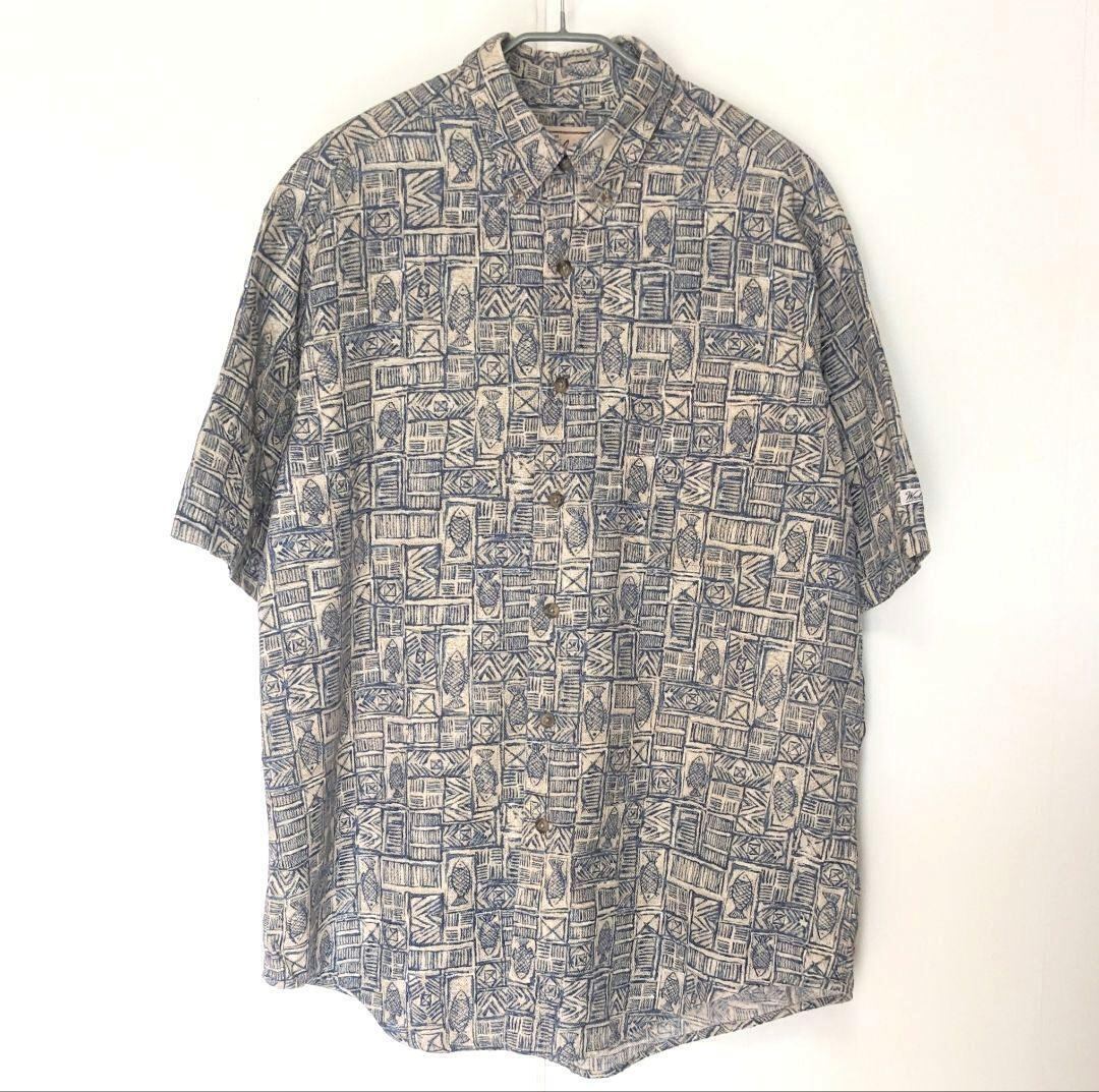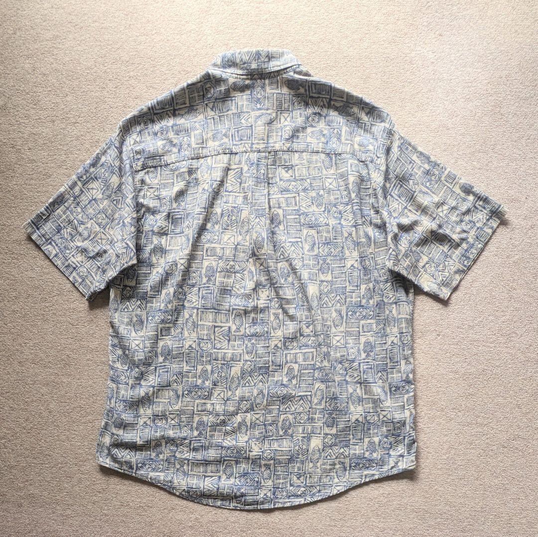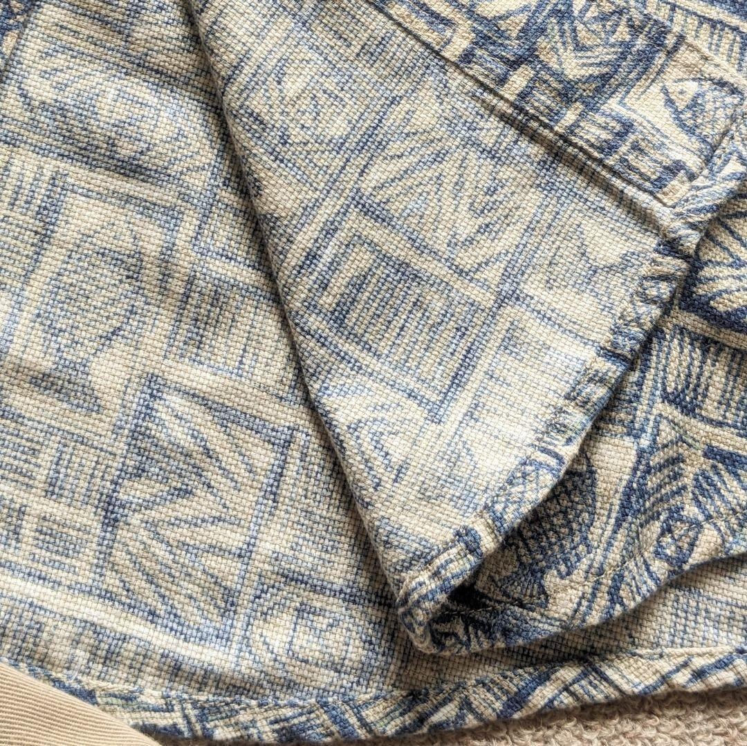 ヴィンテージ特有のくすんだ生成りカラーに、魚柄と幾何学模様が組み合わさった珍しいデザイン。ボタンダウン仕様なので、大人の遊び心あるカジュアルスタイルに最適です。