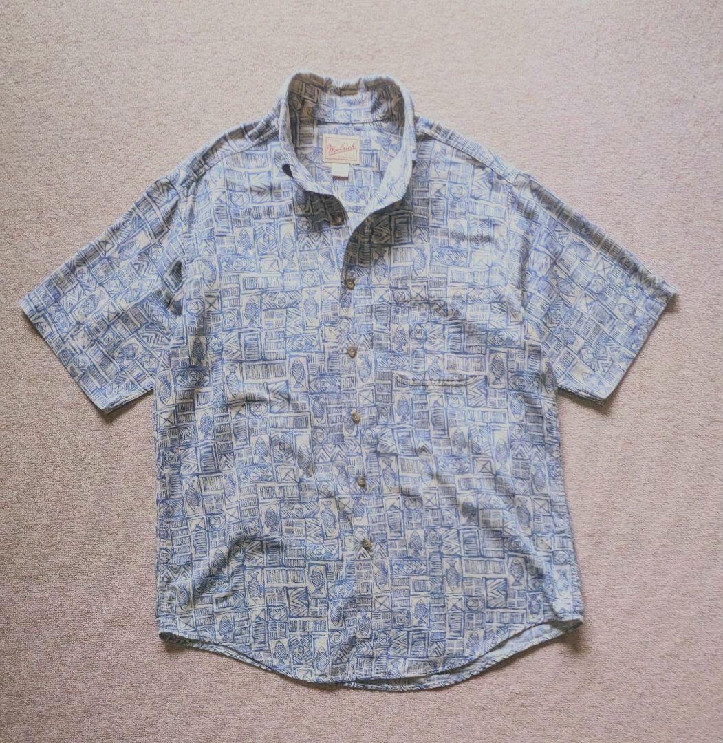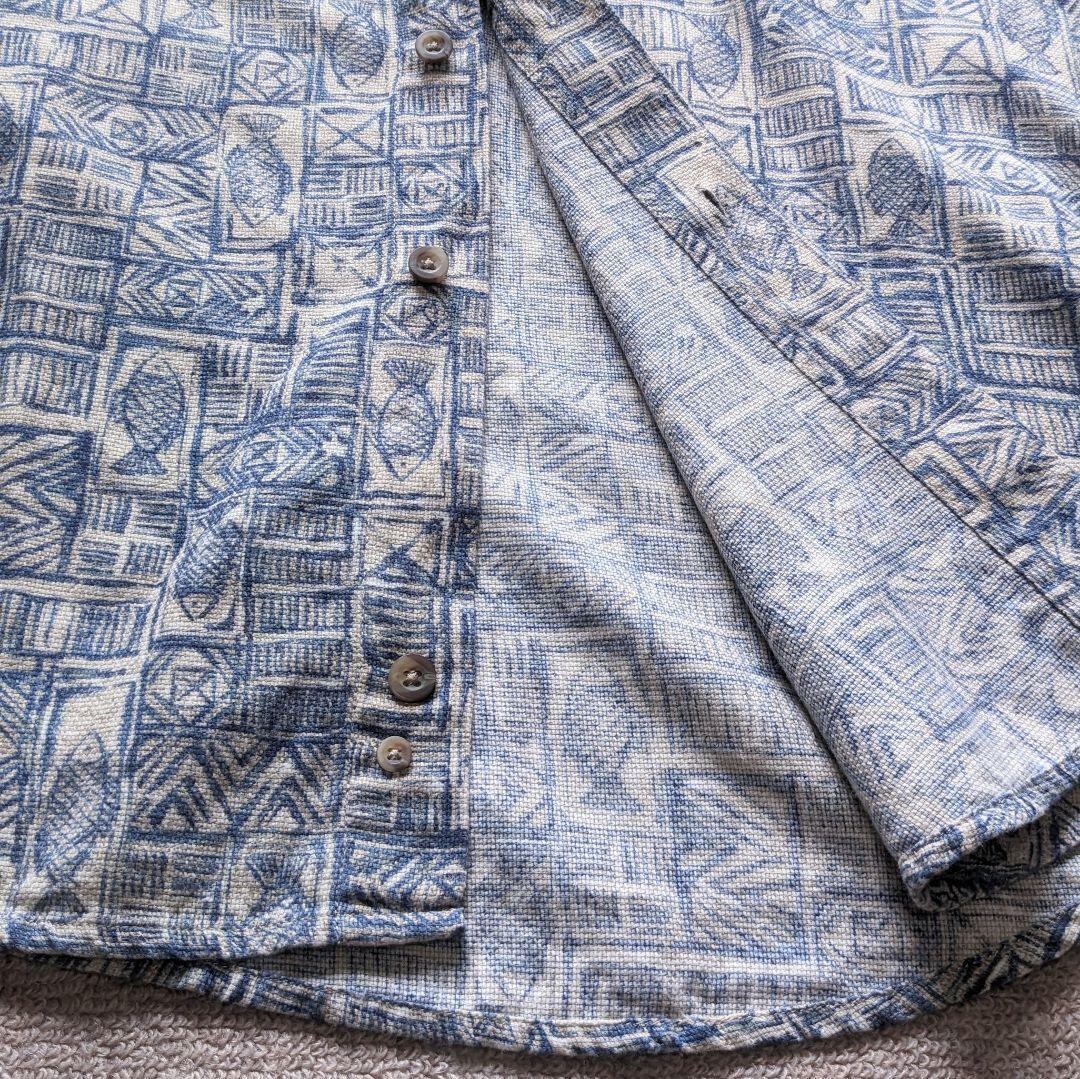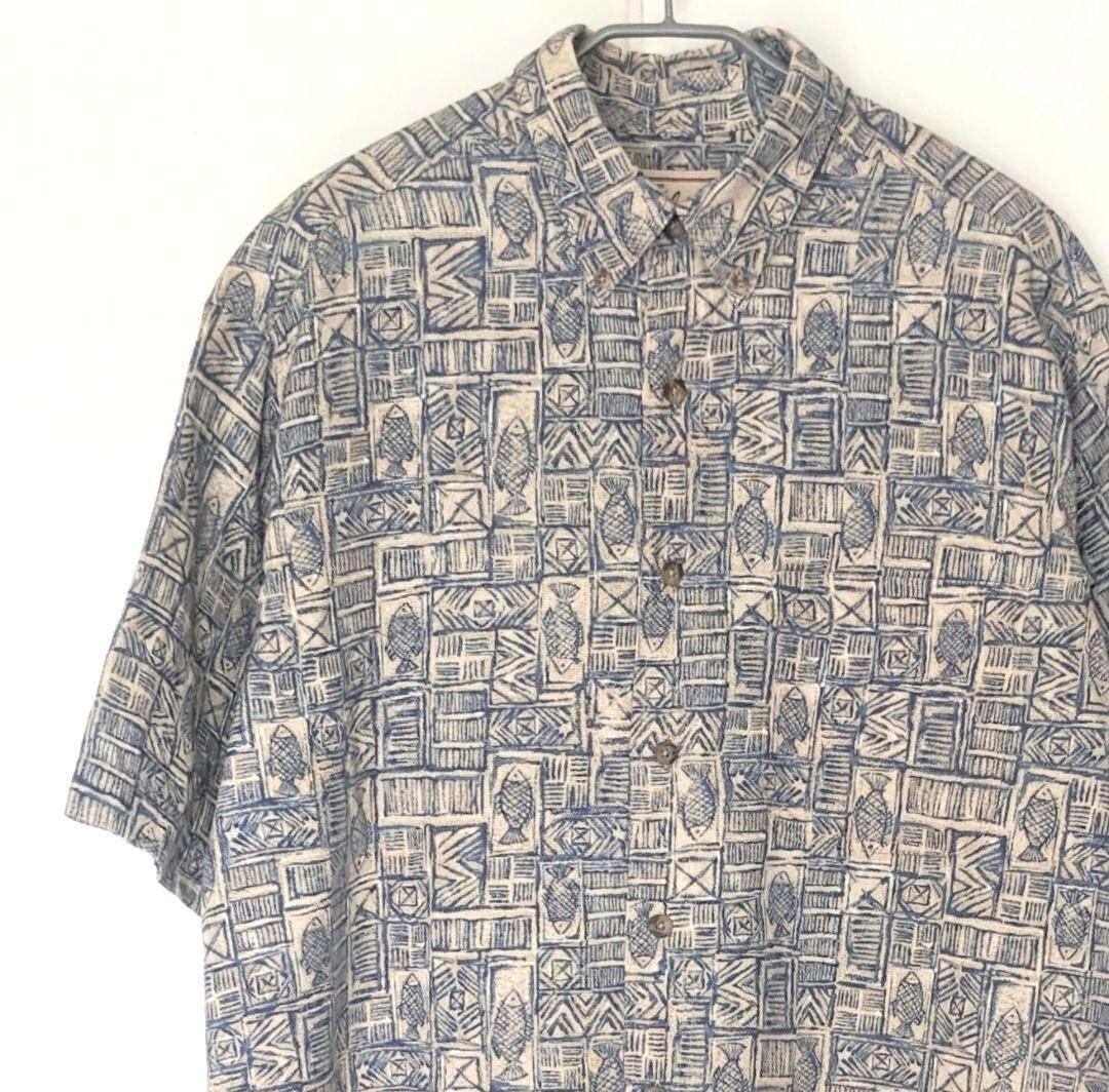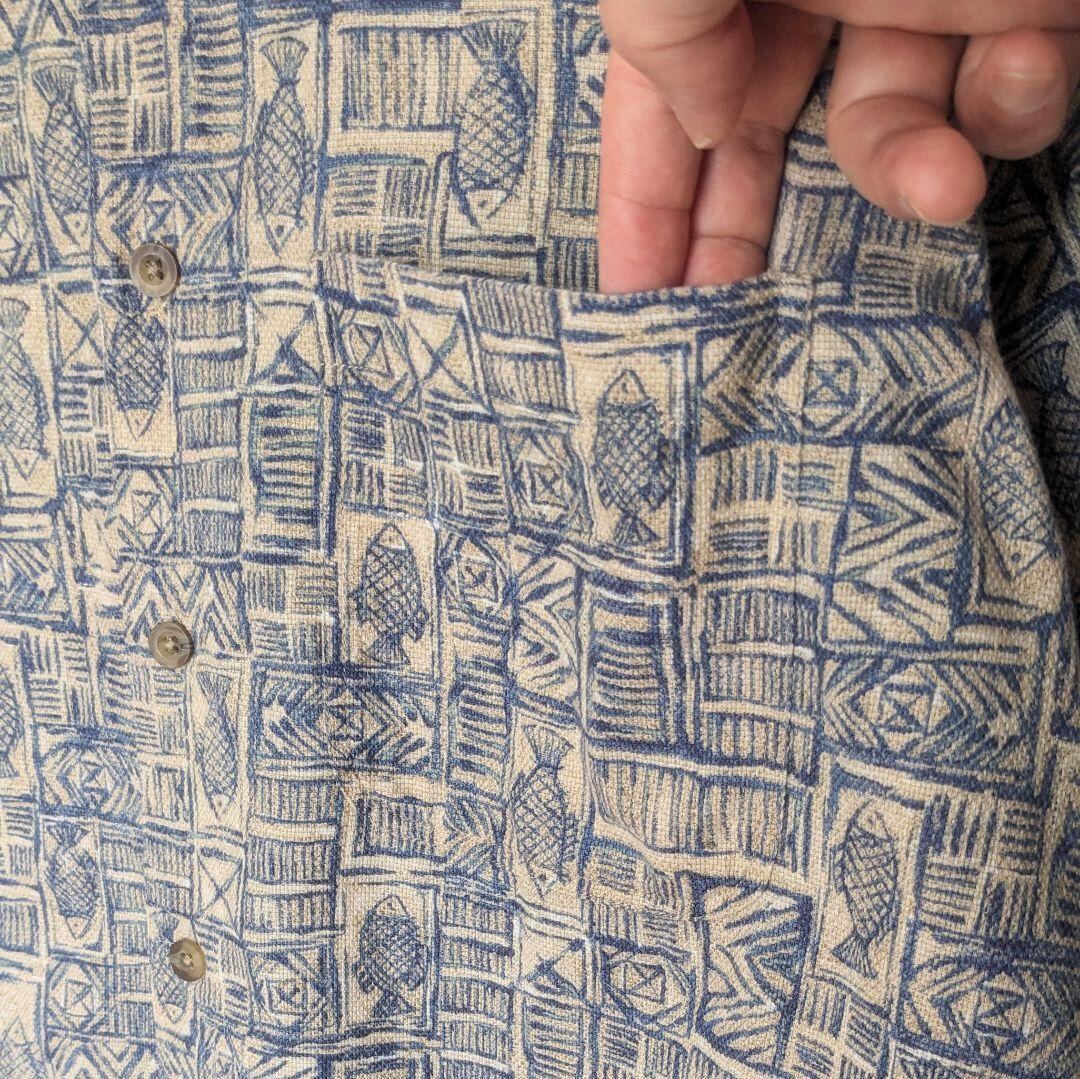 ヴィンテージ特有のくすんだ生成りカラーに、魚柄と幾何学模様が組み合わさった珍しいデザイン。ボタンダウン仕様なので、大人の遊び心あるカジュアルスタイルに最適です。