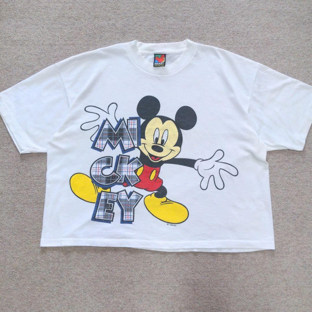 ミッキーのビッグプリントで、珍しい短丈Tシャツですので女性が着ても可愛く重ね着にも最高です